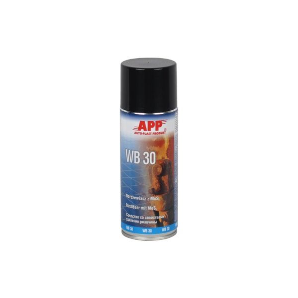 Použitie: WB 30 sa používa na demontáž skorodovaných a zapečených spojov (skrutkové, čapové, klinové) a na čistenie kontaktov. Nevyhnutný pri opravách, demontáži, montáži a konzervácii. Vlastností: Veľmi dobrý mazací a odhrdzovaci vodivý prostriedok. Dlhodobá antikorózna ochrana. Odstraňuje vŕzganie, škrípanie a pískanie. Čisti a konzervuje brzdové systémy, tiahla a reťaze.